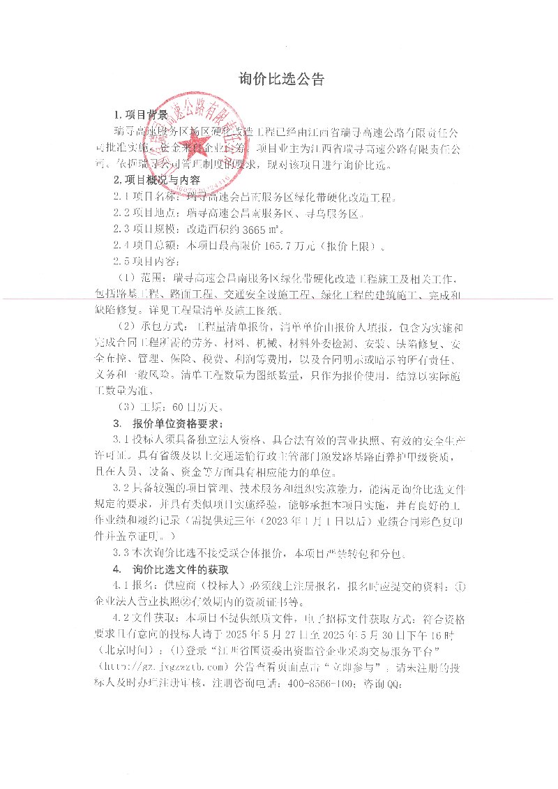 瑞寻高速会昌南服务区绿化带硬化改造工程项目询价结果公示