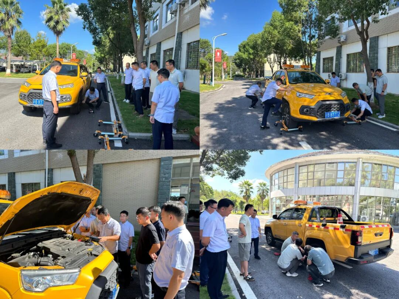 实训演练内容涵盖更换备胎、充气实操、车辆搭电启动、挪车器操作及应急保畅注意事项讲解等多个项目。工作人员首先系统讲解了应急保畅的注意事项,包括基本交通指挥手势、现场安全警示牌的设置、人员分工与协作等。随后现场演示了如何更换备胎与充气,模拟了在电瓶亏电导致车辆无法启动的情形下正确连接搭电线路、启动故障车辆的标准化流程,展示了挪车器的使用。最后参训人员分组进行了实训。