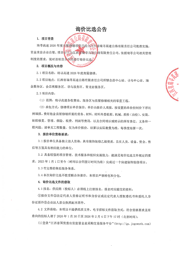 瑞寻高速2026年度房屋修缮项目询价比选公告