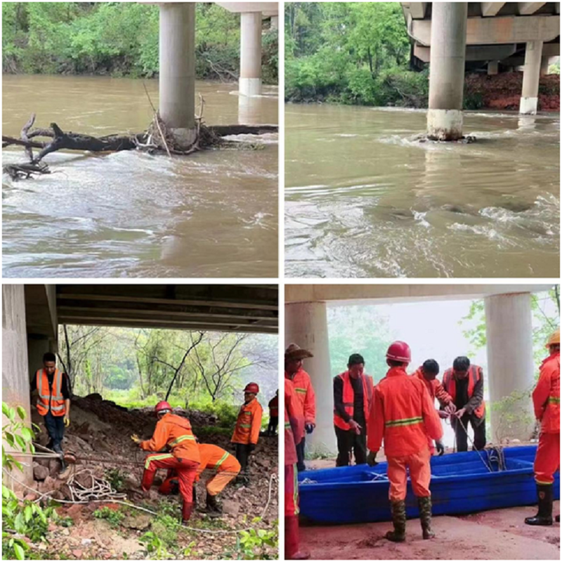 处置现场,由于河水水位上涨、水势湍急,救援船顺着水势难以稳定,作业人员在做好安全防护前提下,将绳索固定在桥墩上,同时安排人员在岸边通过人为控制绳索的方法稳定救援船,作业人员使用电锯将浮木锯断,在大家的协作配合下,树木残枝及浮木得以清理,及时解决了棉水一桥的安全隐患,保障了桥梁的结构安全。