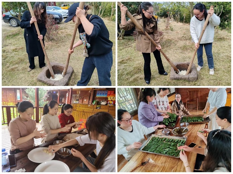 三月的古坊到处鸟语花香,路边草莓园里的草莓鲜红欲滴,让人垂涎三尺;旁边细水涓流的小溪,汨汨动听。桃花漫山遍野,一簇簇一丛丛,粉的、红的交相辉映,大家在桃花树下拍照留念,嬉笑打闹,好一幅美丽的春花烂漫图。打糍粑、做艾米果,公司的女神们各个“摩拳擦掌”,你一锤我一锤,大家团结合作,终于一锅热乎乎的糯饭变成了黏稠的糍粑,抹油、搓团、裹粉,糍粑就算正式做好了。散发着艾香味的面团,你搓面、她包馅、你捏褶子她搓条,大家分工合作,不一会,一个个形状各异的艾米果就做好了。大家吃着自己亲手做的糍粑和艾米果,心里美滋滋的。