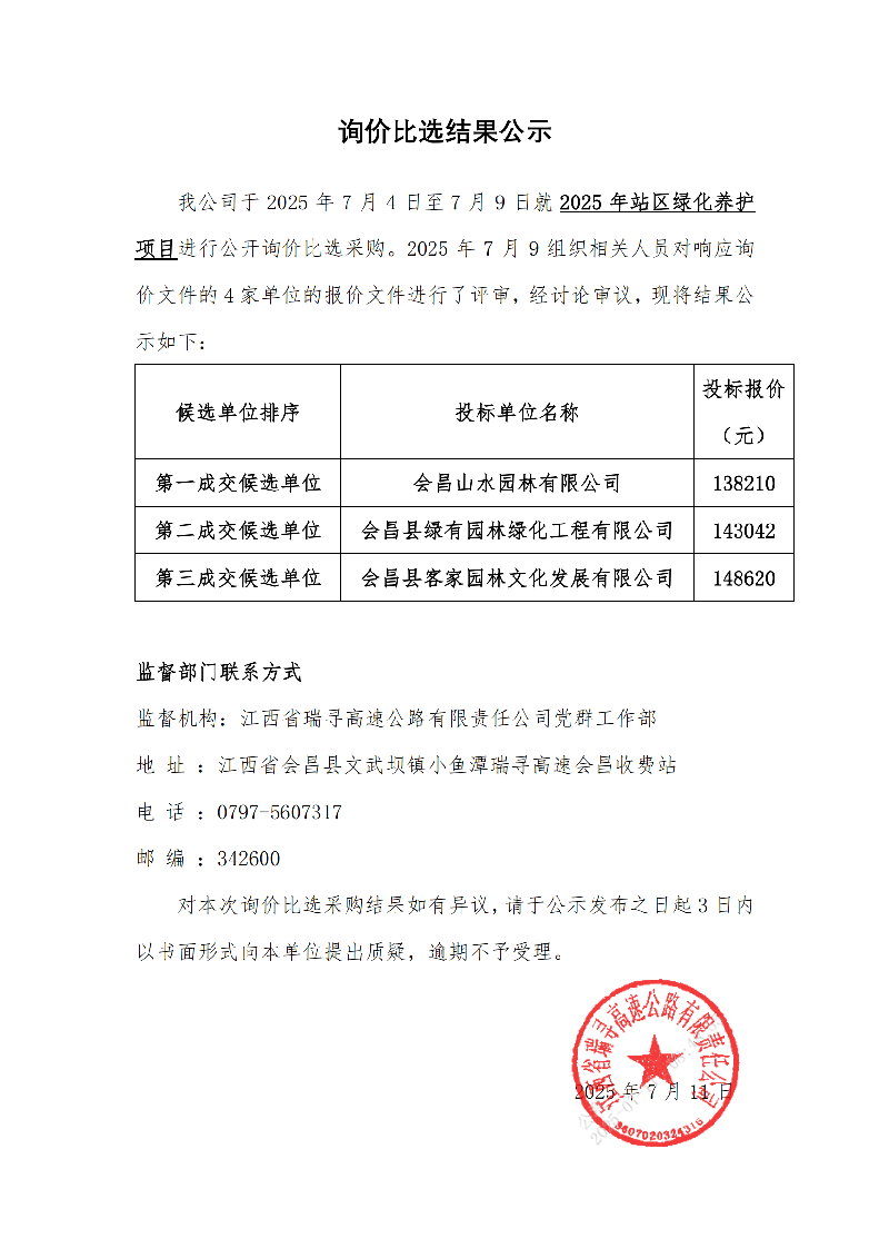 瑞寻高速2025 年站区绿化养护项目公开询价比选结果公告