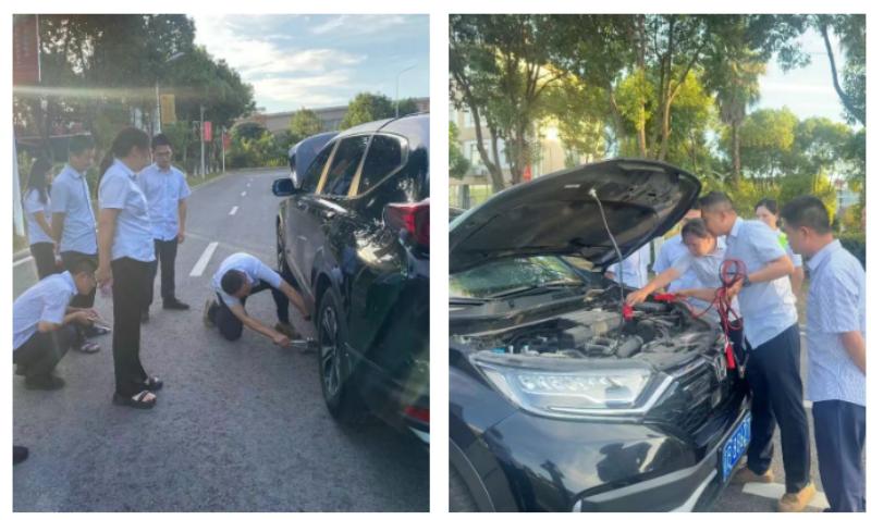 演练聚焦收费站常见救援场景,围绕千斤顶使用、充气泵操作、轮胎更换、电瓶搭电、车辆拖曳等关键项目,开展“手把手”操作教学与实操训练。通过反复练习与逐一现场指导,员工们熟练掌握了各项操作技能,有效提高了实战应对能力。