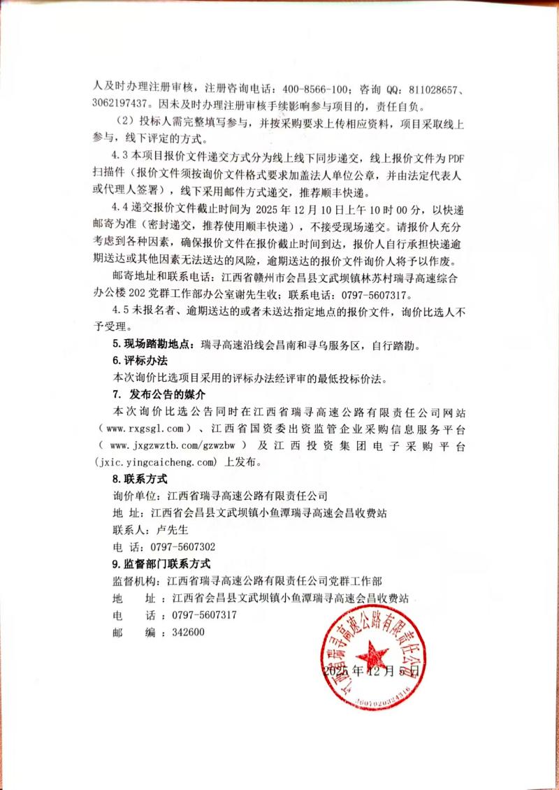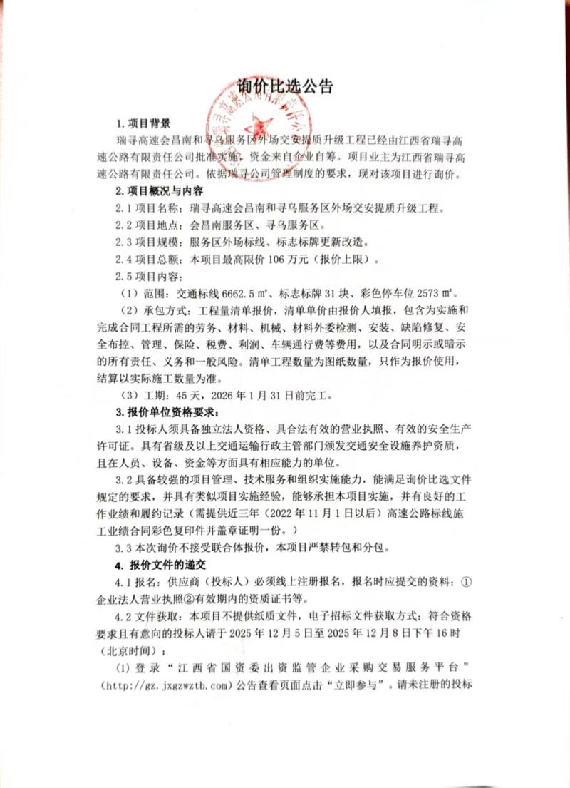 瑞寻高速会昌南和寻乌服务区外场交安提质升级工程询价比选公告