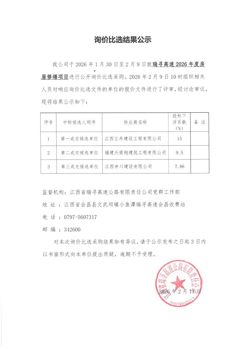 瑞寻高速2026年度房屋修缮项目询价比选结果公示