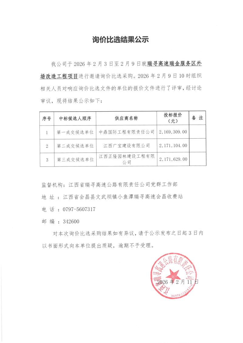 瑞寻高速瑞金服务区外场改造工程项目询价比选结果公示